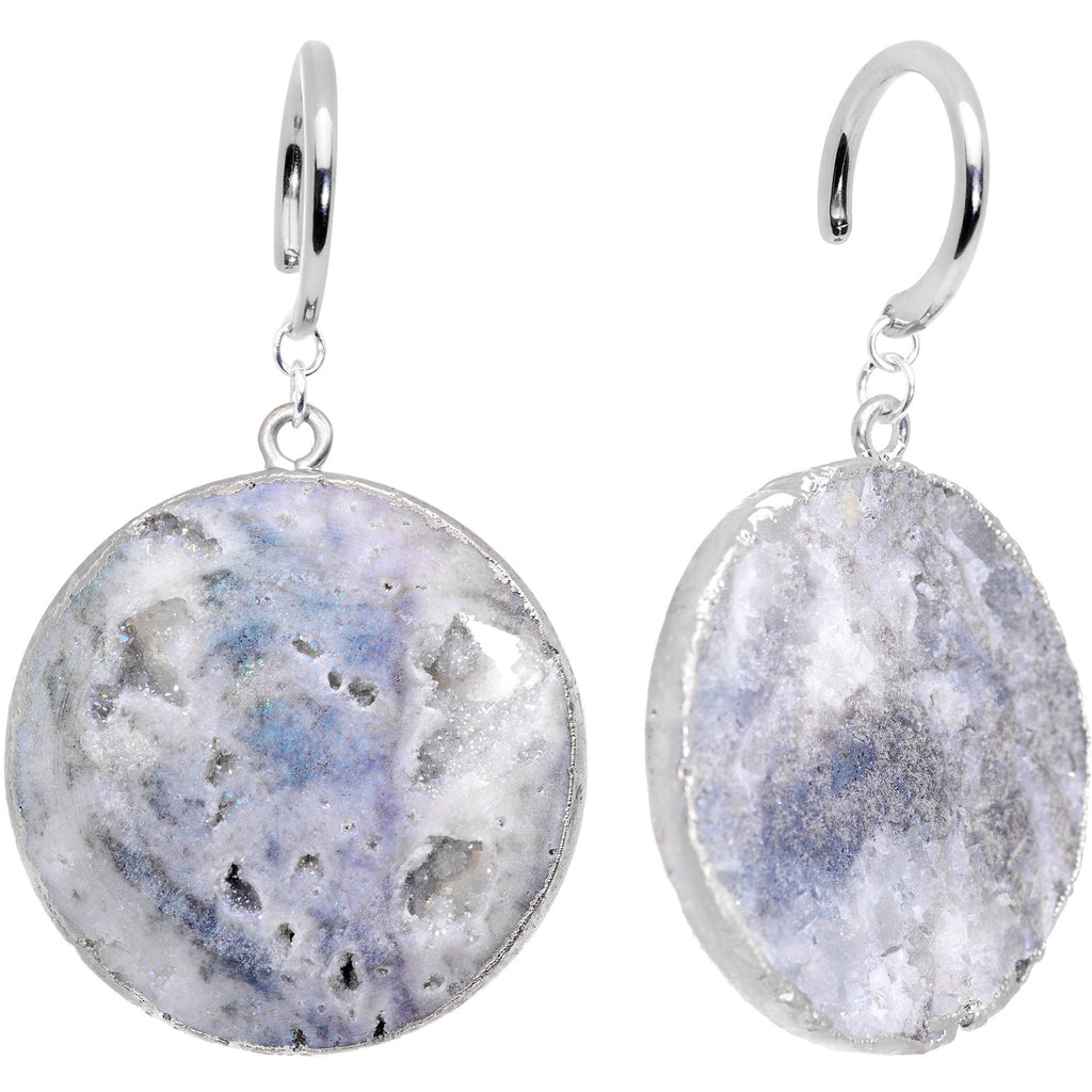 If you dream of the white and silver hues of winter all year 'round then this pair of handcrafted dangle tunnel plug earrings will make you feel like a snow queen. Made with durable 316L surgical grade stainless steel hook backings, these stretched ear hangers require a 10 gauge minimum size, can be worn alone or with tunnel plugs, and are made with natural druzy quartz stone discs that capture all of the beautiful shades of a Buffalo winter! With a total length of 58mm and a weight of 1.6oz, these natural stone ear weights are handmade in the USA and are sold as a set of two for you.